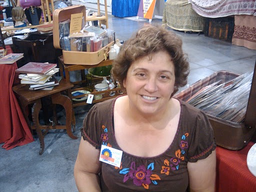 Welcome to our booth at the Antique Expo Show in Portland! In front are vintage postcards I have framed with copper foil and you can see some of the books with gorgeous covers. Yesterday was quite challenging as the temperature flirted with 100 degrees and we worked hard to load all our goodies into our booth.