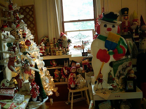Charming vintage santas and snowmen fill our Vintage Christmas display…as well as Lori Mitchell figures and vintage Christmas tablecloths.