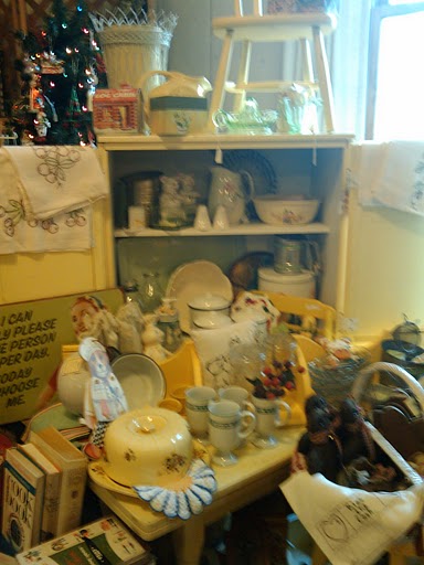 We always have a large vintage kitchen display, with vintage potholders, old cookbooks, lots of kitchen pottery, and so much more. This display is always crammed full of vintage goodies!
