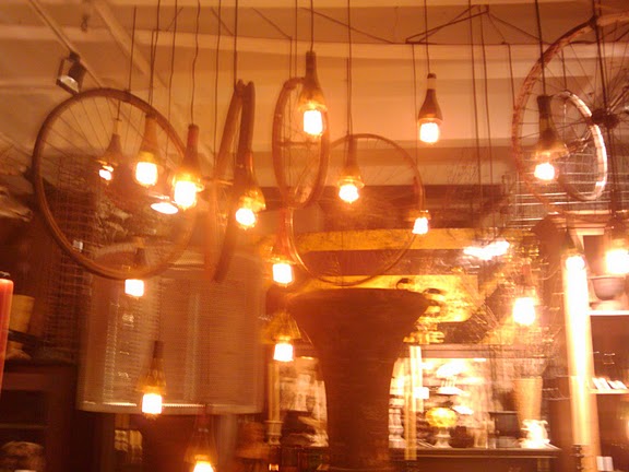 Our very favorite showroom for inspiration is Harvest Goods….every year the showroom is transformed into a new treasure trove of vintage and new and whimsical elements…there’s nothing else like it in all of Market. There’s so much to look at it’s hard to see everything..and it’s decorated from interesting tiles on the floor..to things hanging from the ceiling. This year they had over-sized rusty bicycle wheels and lamps made from wine bottles. It was difficult to photograph….but I wanted a reminder of just how amazing the displays were.