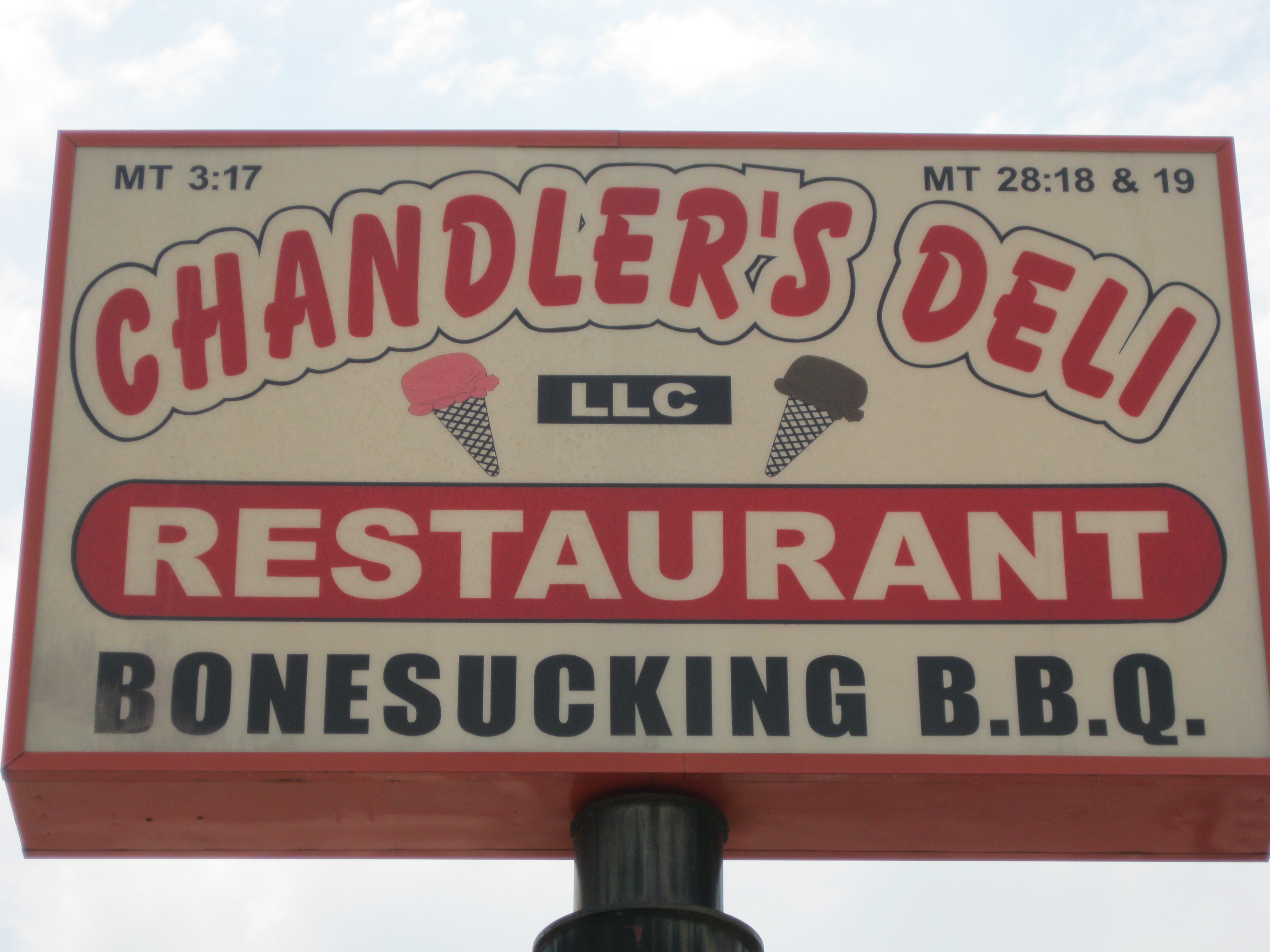 Chandler’s is in a former Taco Bell building…small, pink and unpretentious. You order from a large menu…many types of meat and even more sides. It is served cafeteria style and my large plate of food and a soft drink cost me ten bucks, with tax. It’s an incredible deal. The meat special today was meatloaf, served with gravy or ketchup, and I also ordered mashed potatoes, broccoli in cheese sauce, mac n’cheese and corn bread. It was way too much food and I was only able to eat about half my plate…but I couldn’t resist trying all those yummy southern sides!