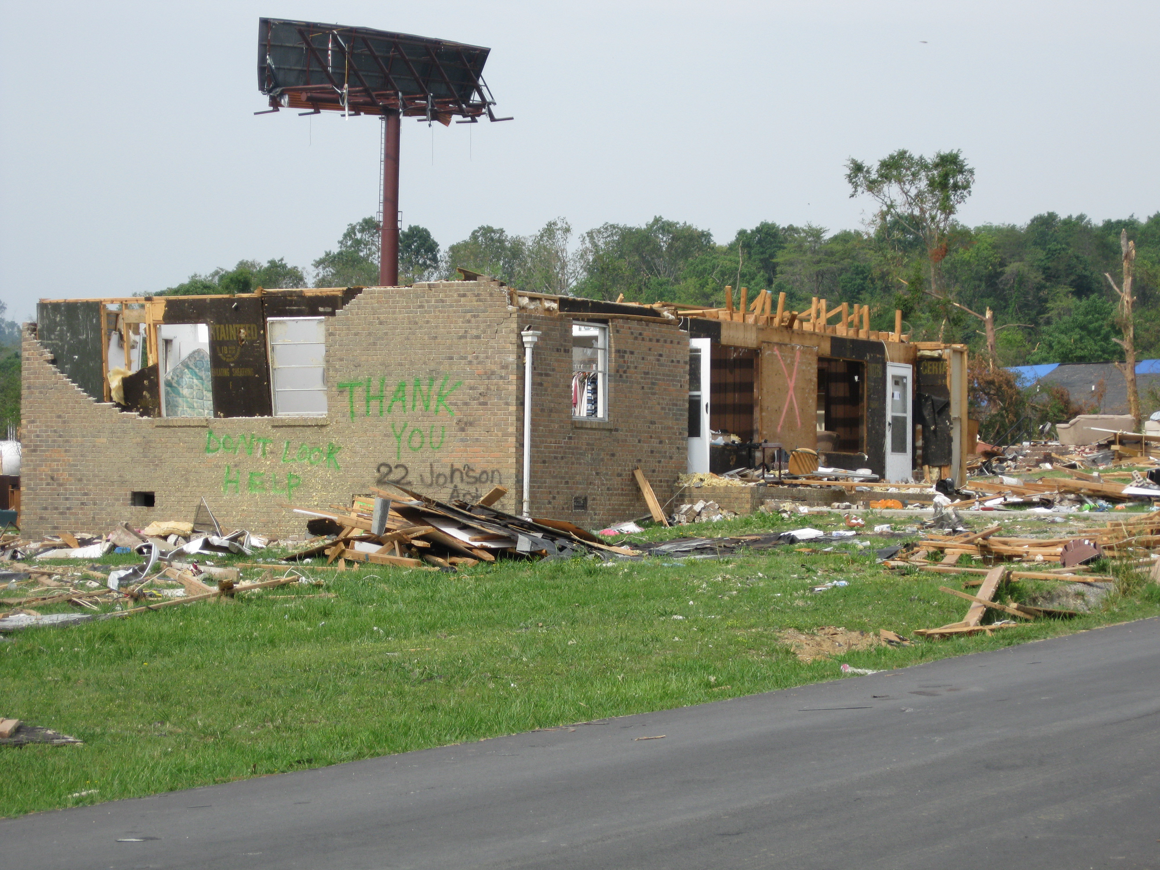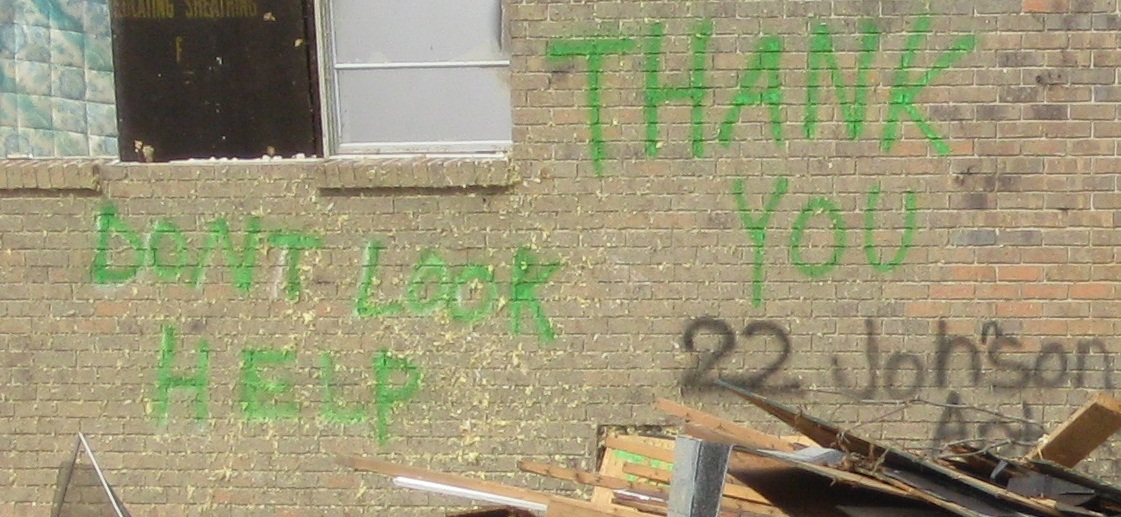 We saw trees toppled over and roofs partially gone in many places, but until we reached the actual path of the tornado, we had no idea just how bad it really was. We had to pull over and take it all in. On the side of one destroyed building was spray-painted a simple message. “Dont look…help. Thank you.” And in the end, that’s all we can do. Help those who lost their homes and mourn those who lost their lives. And pray that they never have to suffer this way again.