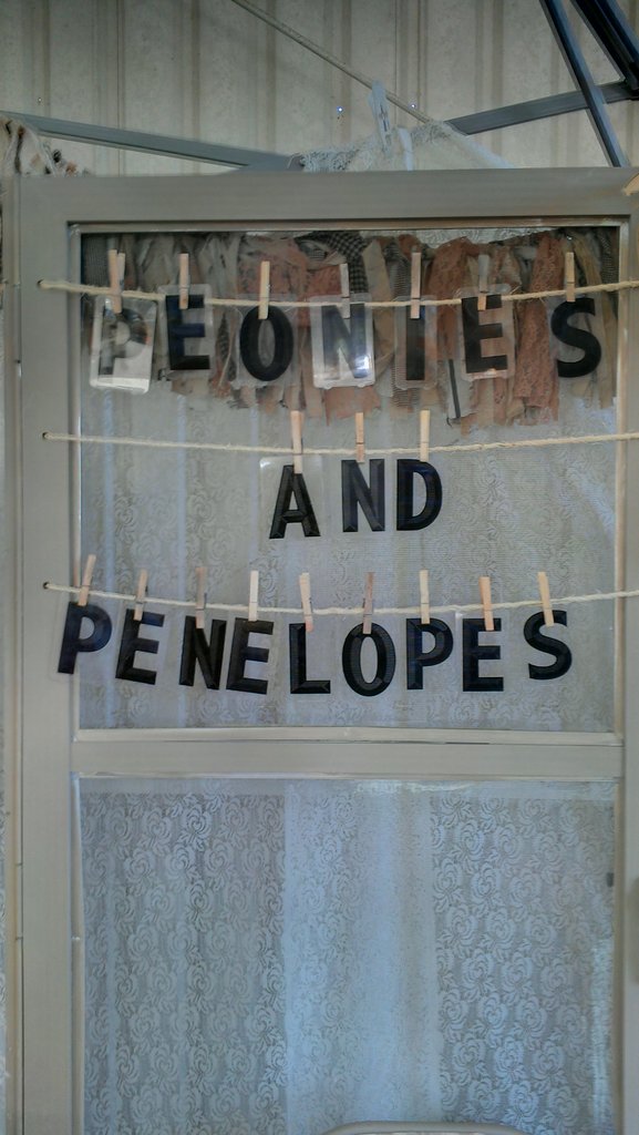 We recently did the Plucky Maiden Junkfest event at Oaks Park in Portland and we were very pleased with the show and the response to our booth. We had worked hard at doing fabric fringe banners to go around the top of the booth and made more of the large paper flowers. But best of all, I found an old screen door and old supermarket sign letters and Pam painted it and added the twine and old clothespins and we were thrilled with our new addition that stands behind our check-out desk!